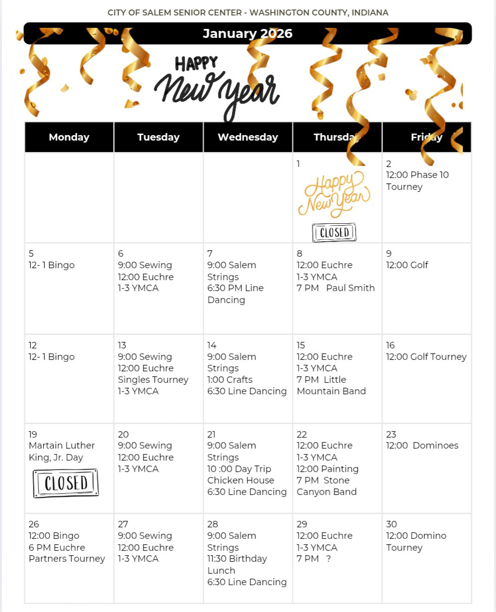 The Senior Center is located at 1705 North Shelby Street and open Monday - Friday from 9:00am - 4:00pm. The upcoming events are provided in the calendar.